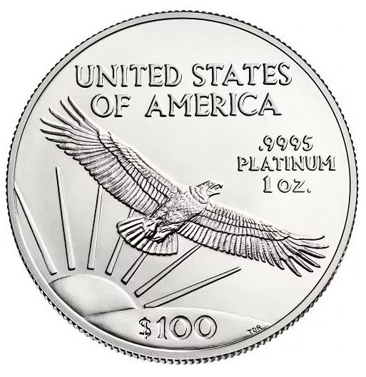 On the reverse side is the image of a bald eagle soaring over the setting sun. Engravings on this side include United States of America, as well as the coins weight, metal content, purity, and face value. All American Platinum Eagle coins are struck using .9995 platinum and carry a face value of $100, the highest face value of any 1 oz bullion coin from the US Mint.