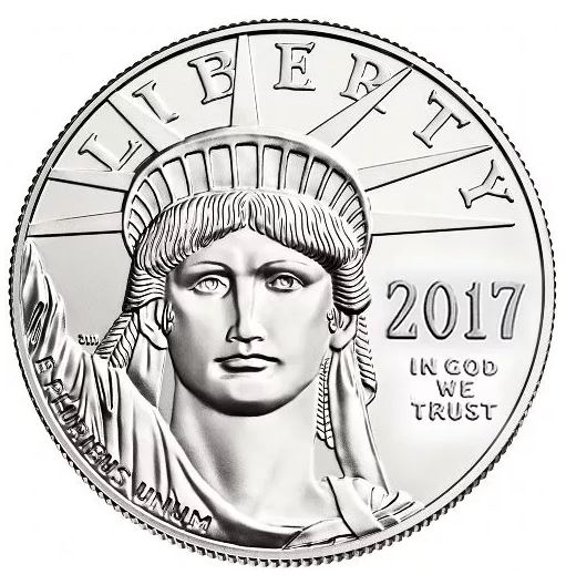 John Mercanti, the US Mint chief engraver responsible for the reverse design of the American Silver Eagle coin, designed the obverse image used on the American Platinum Eagle coin. His image focuses on the head of the Statue of Liberty, with her gaze fixed in the distance. The word LIBERTY is stretched along the top of the coin and accompanied by the engravings of the year of minting and the phrase In God We Trust.